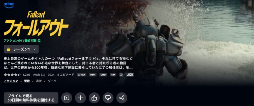 核戦争後の荒廃した世界を舞台に、人々がどのように生き延びているのかを描くポストアポカリプスSFドラマです。地下シェルターと地上世界という対照的な環境を行き来しながら、価値観や常識の違いが浮き彫りになっていきます。ブラックユーモアと残酷さが同居する独特の世界観が魅力で、原作ゲームを知らなくても問題なく楽しめる構成。重厚な設定のSFが好きな方におすすめです。