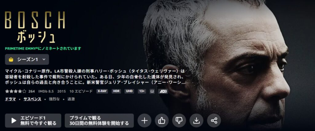 『ボッシュ(BOSCH)』は、ロサンゼルス市警殺人課の刑事ハリー・ボッシュが、揺るがぬ信念と正義感を貫きながら凶悪事件に挑む本格犯罪ドラマ。母親殺しの真相、マフィアとの抗争、警察内部の腐敗など、複雑な陰謀が物語に深みを与えます。